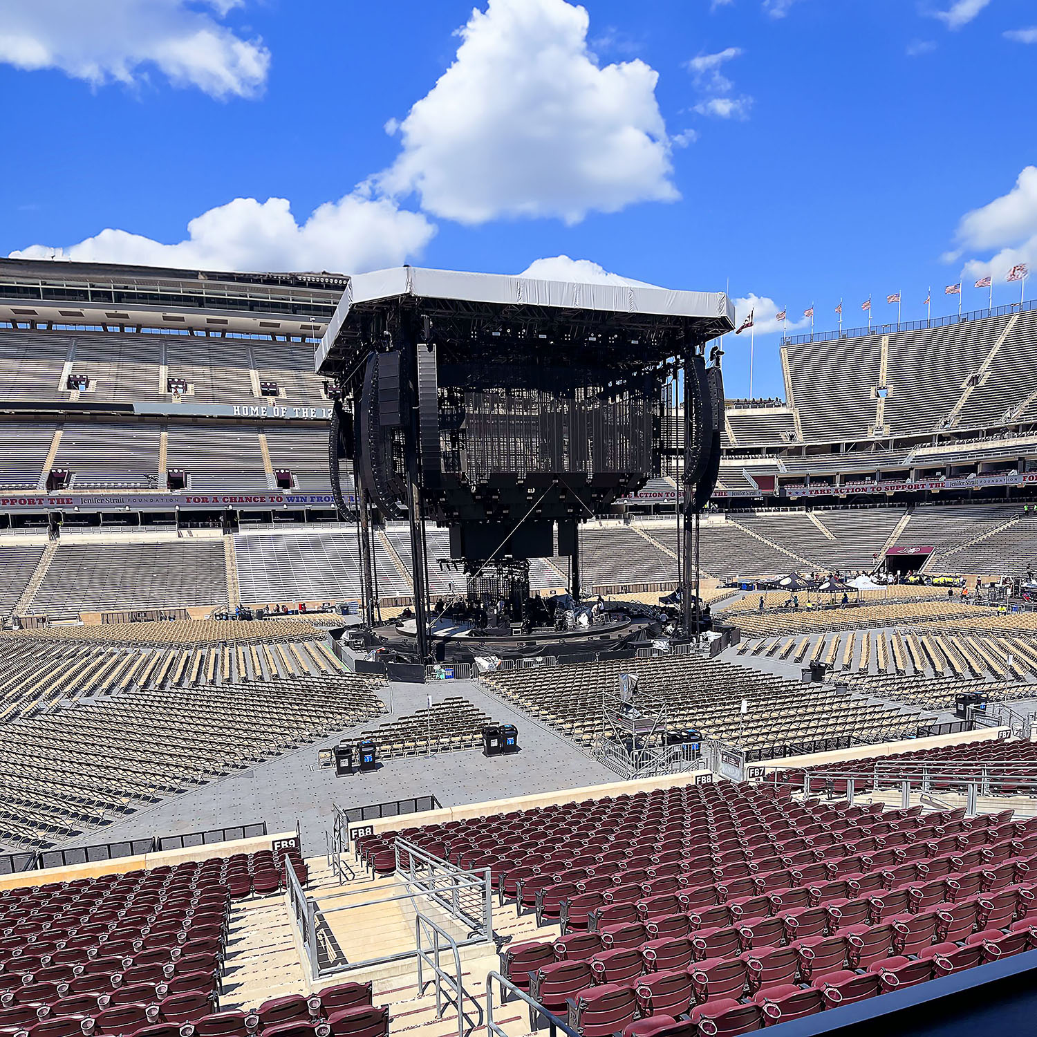 In addition to being responsible for a full stadium reset ahead of the George Strait concert, our team had the added challenge of caring for additional spaces during setup. As the stage and other key performance equipment was assembled, the SSC team removed trash, cleaned the field area after crew meals, and performed regular cleanings to ensure even the stadium and setup crew saw Kyle Field looking its best.